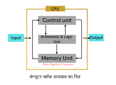 ब्लाक डायग्राम में CPU को कंट्रोल यूनिट कहा जाता है यह कंप्यूटर का सबसे महत्वपूर्ण घटक है जो यूजर के द्वारा दिए गए इनपुट को प्राप्त करता है और उन्हें आउटपुट प्रदान करता है कंप्यूटर कि साडी प्रक्रियाये CPU में EXECUTE होती है इसमें डेटा को प्राप्त करना स्टोर करना और उसकी कैलकुलेशन करना जेसे कार्य शामिल हैCPU की दो यूनिट होती है