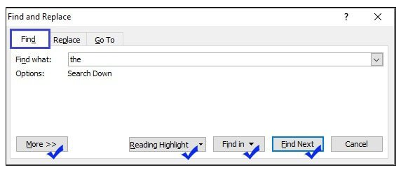 FIND:-इसका इस्तेमाल करके आप अपने डॉक्यूमेंट में किसी भी टेक्स  पेराग्राफ को खोज सकते है इसका शॉर्टकट key  ctrl+F  है (Using this you can search any text paragraph in your document, its shortcut key is ctrl+F)