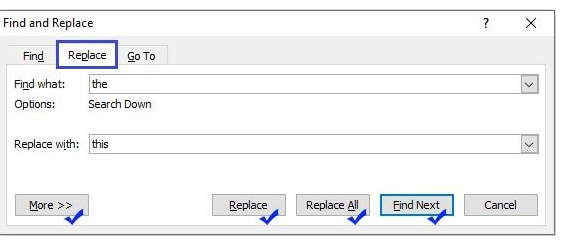 (Using this option you can replace any word in your document with another word, its shortcut key is ctrl+H)