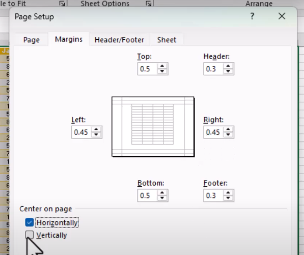 STEP 4 : SET PAGE MARGIN :- कोई भी डाटा बनाने या ms excel में काम करने से पहले हम मार्जिन सेट करते है ताकि वर्कशीट एक जगह ही set रहे तो पेज मार्जिन सेट करने के लिए PAGE LAYOUT TAB में जाये OR MARGIN में CLICK करे और निचे CUSTOM MARGIN में क्लिक करेंगे तो आपके पास PAGE सेटअप का FORMAT OPEN हो जायेगा अब इसमें TOP OR BOTTOM में 0.5 रख लेंगे और LEFT OR RIGHT में 0.45 रख लेंगे और HORIZONTALY OR VERTICALY दोनों में TIK MARK रखना है और OK BUTTON PRESS कर लेंगे इससे ये होगा ही आपके जयादा से ज्यादा डाटा एक पेज पर Fit आजायेगा