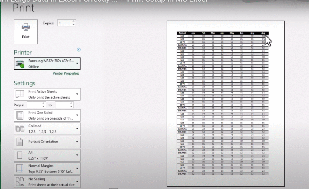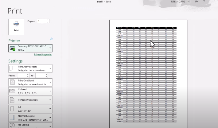 अब आप CTRL + P BUTTON PRESS करेंगे तो आप देखंगे कि आपका प्रिंट एरिया सेट हो गया है और जो डाटा हम प्रिंट करना चाहते है वो ही प्रिंट होगा पर अभी भी डाटा पुरे पेज में नहीं आ रहा है तो इसके लिए भी हमे कुछ सेटिंग करनी होगी