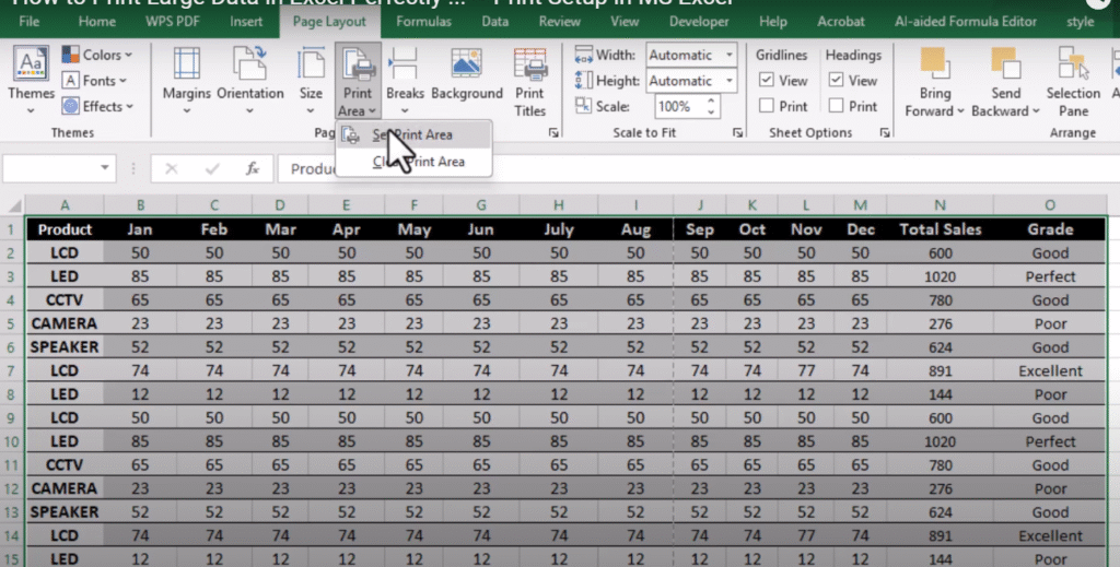 तो प्रिंट निकालने से पहले हम सेट करेंगे प्रिंट एरिया (Print Area) जिसकी मदद से आप जो भी डाटा आप प्रिंट करना चाहते हो वो प्रिंट कर सकते हो तो सबसे पहले आपने अपने डाटा को सेलेक्ट करना है जो भी आप प्रिंट करना चाहते हो जैसे कि हम निचे दिए गए डाटा दो सारा प्रिंट करना चाहते है तो हम अपने डाटा को सेलेक्ट करेंगे जिसके लिए शॉर्टकट key CTRL +SHIFT+ RIGHT ARROW और Ctrl +Shift + DOWN ARROW BUTTON PRESS करेंगे तो आपका डाटा सेलेक्ट हो जायेगा उसके बाद आपने MS Excel के Page Layout Tab मैं जा के Print Area ka Option सेलेक्ट करना है और आपका Print Area set हो जाये गा जिस डाटा आप प्रिंट निकलना चाहते है