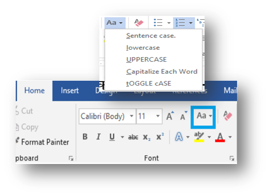 STEP 2:- अब होम टैब के Font Group के अंदर change case option पर क्लिक करे मान लीजिये की आपको सेलेक्ट किया गया टेक्स्ट को Uppercase में Change करना है तो Uppercase Option पर click करे
