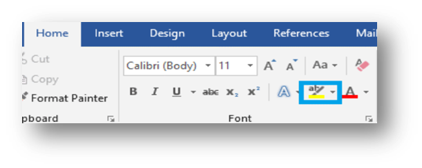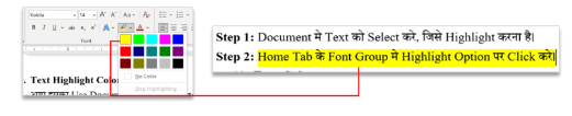 STEP 2:-Home Tab के Font Group मे Highlight Option पर click करे और अपने According color को Choose करे