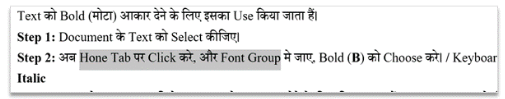 BOLD:–MS WORD में होम tab के अंदर फॉण्ट ब्लाक में बोल्ड का option दिया होता है जहाँ से किसी भी टेक्स्ट को बोल्ड कर सकते है या उसको गाड़ा में दिखा सकते है इसकी शॉर्टकट key ctrl +B है
