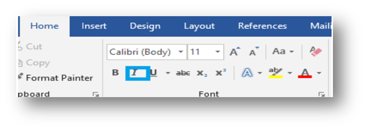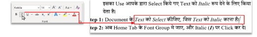 STEP 2:- अब HOME TAB के FONT GROUP में जाए और Italic (I) पर क्लिक कर दे