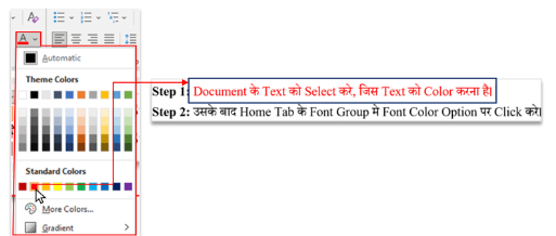 STEP 2: – उसके बाद HOME TAB के FONT GROUP में FONT COLOR OPTION पर क्लिक करे अब आप अपने According Color को Choose करे