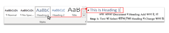 NOTE: – इसी प्रकार आप आपके Document में heading 2, Heading 3 etc. Apply करना है तो आप Style group के drop down arrow पर clickकरके कर सकते है