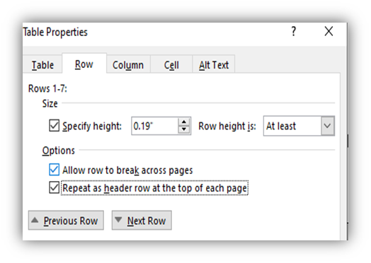- Right –Click >Table Properties > Row Tab